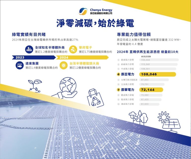 辰亞能源在綠電直轉供的成績穩居市場居於領先地位,且與多家半導體及產業龍頭建立長期的合作關係。