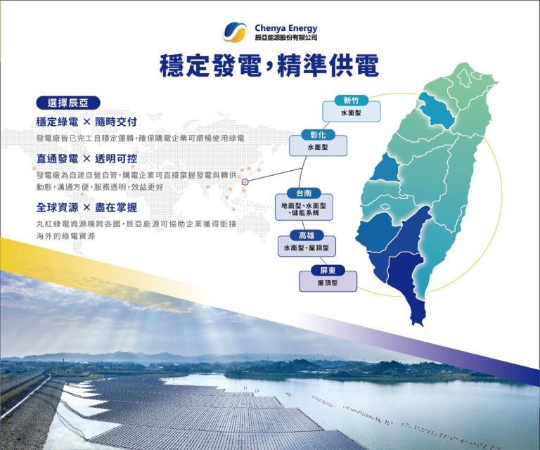 藉由對水面型、地面型、屋頂型太陽能電廠和儲能系統布局。近年來,辰亞能源也成功協助眾多企業導入穩定、透明、可追溯的綠電,包括遠東集團、華邦電子及多家全球頂尖半導體大廠,陸續簽署多項長期綠電採購協議(CPPA),累積規模達數十億度電,是半導體產業鏈最佳的綠電合作夥伴。